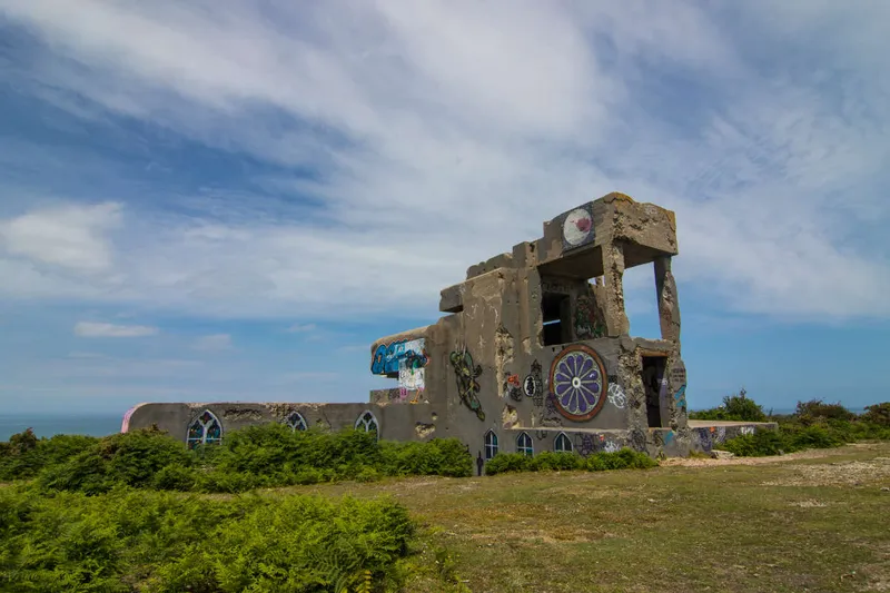 Auf Ihrem weiteren Weg Richtung Cap Levi bei Fermanville können Sie am Strand die ehemalige deutsche Batterie de Caqueret entdecken oder zusammen mit Ihrem Hund das Vallee des Moulins erkunden. Neben zahlreichen Mühlen ist das ehemalige Eisenbahnviadukt über das Tal beeindruckend. Am Cap Levi lohnt der Abstecher zum Parkplatz unterhalb des Leuchtturms und zum kleinen Hafen. Hier bietet sich ein Spaziergang entlang des Zöllnerpfades an und mit etwas Glück begegnen Ihnen sogar ein paar Basstölpel. Oberhalb von Fermanville befinden sich die Überreste der Batterie du Brulay. Der marode Charme der Anlage wird durch die zahlreichen Graffitis noch unterstrichen und die Aussicht über die Bucht bis nach Cherbourg ist einfach fantastisch. In der wilden Naturlandschaft bis zum Anse du Brick grasen verwilderte Ziegen, die Ihren Weg kreuzen. [caption id="attachment_2921" align="aligncenter" width="1200"]